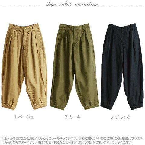 仕様パンツ ※モデル身長:166cm素材 綿100%サイズ【M】ウエスト64/32cm・ヒップ57cm・股上前32cm・股上後40.5cm・わたり幅40cm・股下66cm・裾幅16cm 【L】ウエスト68/34cm・ヒップ59cm・股上前33cm・股上後41.5cm・わたり幅41cm・股下66cm・裾幅17cm 【LL】ウエスト74/37cm・ヒップ62cm・股上前34cm・股上後42.5cm・わたり幅42.5cm・股下66cm・裾幅18cm 【3L】ウエスト80/40cm・ヒップ65cm・股上前35.5cm・股上後44cm・わたり幅44cm・股下66cm・裾幅19cm 【4L】ウエスト88/44cm・ヒップ69cm・股上前45.5cm・股上後45.5cm・わたり幅46cm・股下66cm・裾幅20cm カラー1.ベージュ・2.カーキ・3.ブラックメール便配送メール便不可商品説明タック入りアラジンパンツサルエルパンツ。