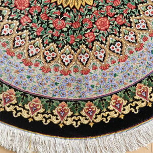 サイズ/房含まず:直径103cm 厚み: 9.02ミリ程度 産地:イラン・クム 素材:ウール・シルク(縦糸シルク) 織りタイプ:手織り ※お受取り後はすぐに状態をご確認ください。