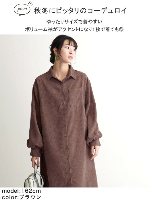 コーデュロイ シャツワンピース ボリュームスリーブ ロング ワンピース レディース 秋 長袖 秋冬 ゆったり 体型カバー 羽織り 大きいサイズ 大きめ カジュアル 大人 可愛い おしゃれ 無地 ピンク モカ グレー ブラック 黒 翌日配達